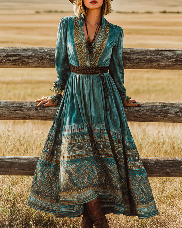 Women's Retro Western Embroidery Contrast Color Stitching Autumn and Winter Dress dcb9