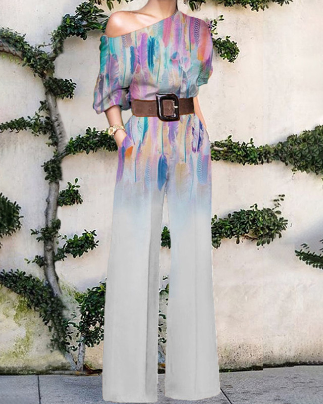 Women's Light Line Watercolor Floral Pattern Art Print Casual Suspenders Wide Leg Pants 4f26