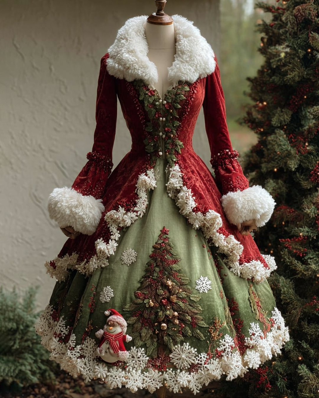 Christmas Themed Contrasting Color Snowman Christmas Tree Embroidered Fur Collar Dress 5772