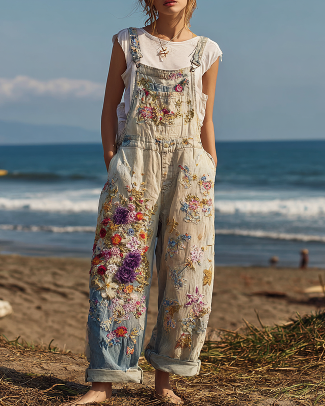 Summer Holiday Lace Handmade Floral Embroidery Overall Jeans 0e7a